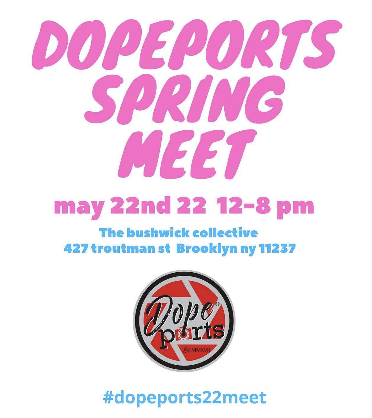 DOPEPORT EVENTSHELD BY DOPEPORTSDATE: May 22, 2022Event: Dopeports Spring 2022 MeetupLocation: 427 Troutman St, Brooklyn Dopeports is a FEATURE PAGE & PHOTOGRAPHY COMMUNITY based out of NEW YORK CITY. Owner Raul Vargas and the head moderator Cindy Holder throwing different events including photography meetups, private studio shoots and workshop events. BUY TICKETS Spring Meetup 2022